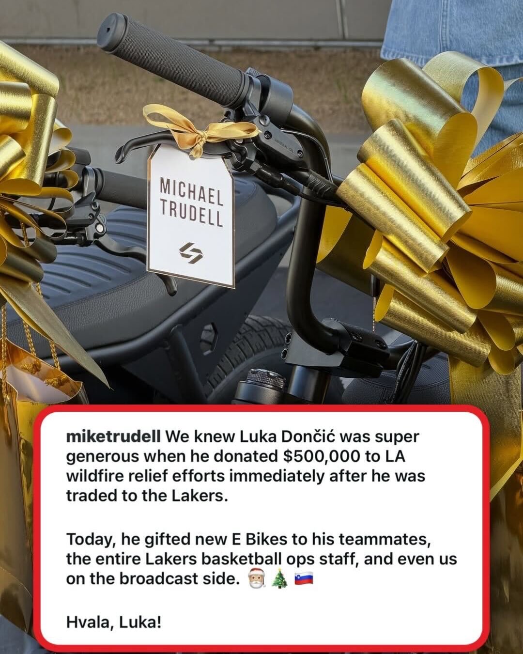 湖东说念主随队记者Mike Trudell更新INS晒照感谢卢卡,配文写说念:咱们都知说念卢卡·东契奇相当清脆——在被往来到湖东说念主后,他立即为洛杉矶野火解救捐钱50万好意思元。如今,他又为队友、通盘湖东说念主篮球运营团队,致使咱们转播团队的系数东说念主都施助了清新的电动自行车,谢谢你,卢卡!