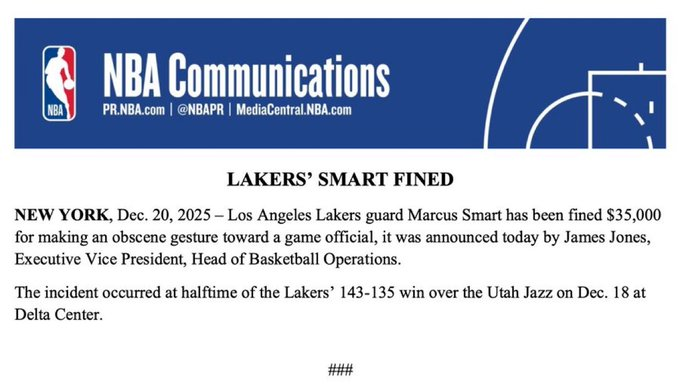 北京手艺12月21日,NBA官方文书,湖东说念主后卫马库斯-斯马特因“向赛场裁判作念出瞻念手势”,被处以3.5万好意思元罚金。