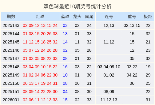 双色球近10期奖号数据统计图表