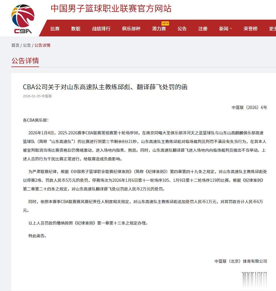 把柄CBA官方公布料理决定:山东队主教会邱彪因对裁判判罚起火,在被取消比赛阅历后仍脸色欣慰插足款式抗议,被禁赛两场并罚金5万元;翻译薛飞因插足款式内对裁判作念出不当举动被罚金2万元。此外,依照本赛季CBA联赛赛风赛纪背负东谈主轨制相关法律阐明注解,对山东高速队主教会邱彪追加料理东谈主民币1万元,对其罚金共计东谈主民币6万元。