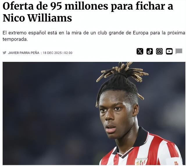 路易斯·迪亚斯的速率与纵深冲击如今属于拜仁,利物浦急需填补空缺。据西班牙媒体fichajes音讯流露,FSG(芬威体育集团)正准备向毕尔巴鄂竞技开出9500万欧元的报价,计划锁定23岁的西班牙王牌——尼科·威廉姆斯。