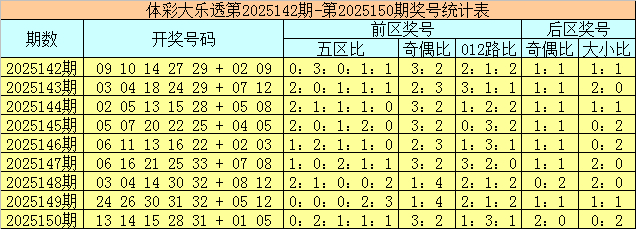 体彩大乐透第2025150期奖号为13 14 15 28 31 + 01 05,前区号码五区比为0:2:1:1:1,奇偶比为3:2,012路比为1:3:1,后区号码奇偶比为2:0,大小比为0:2。